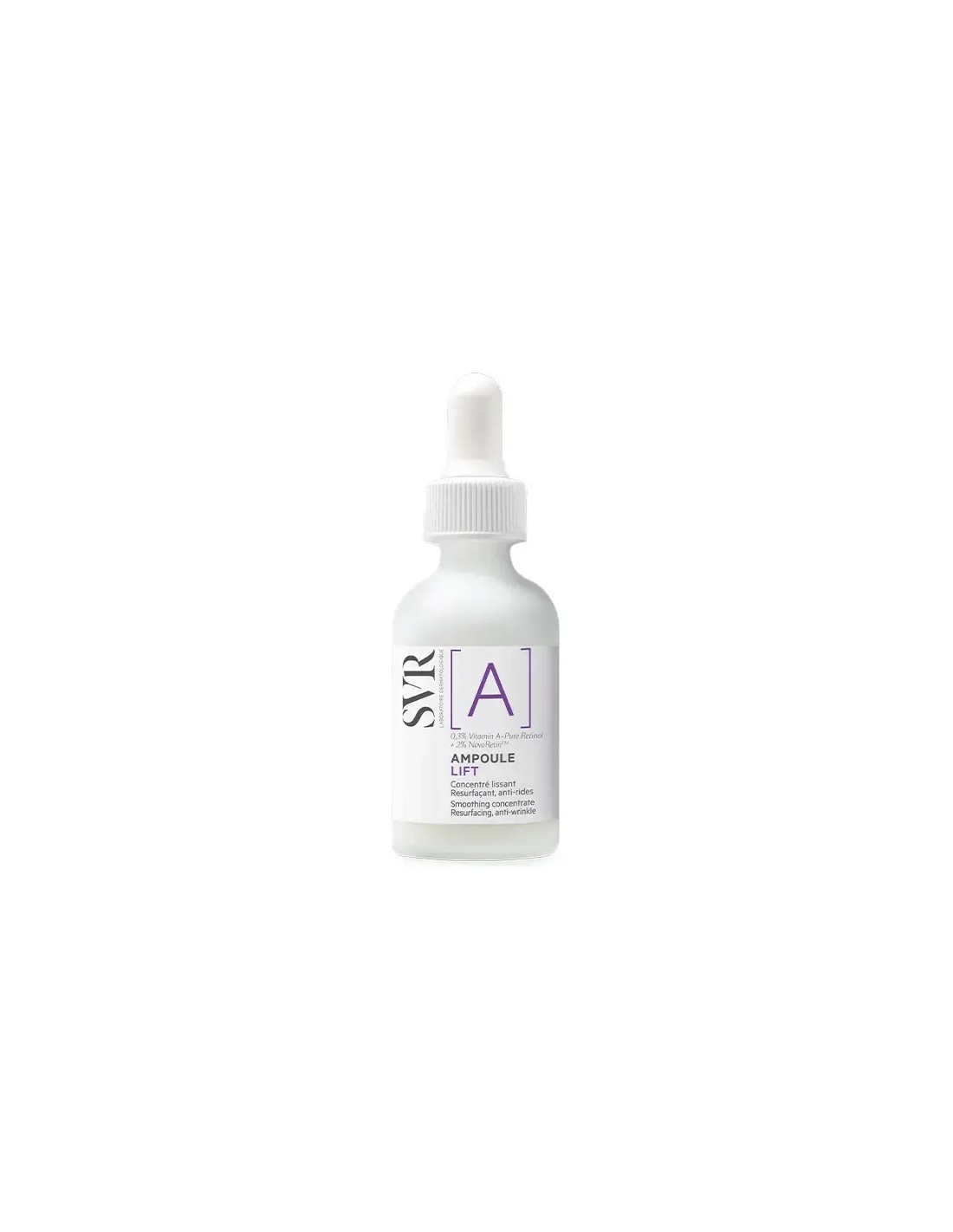 La fórmula de SVR AMPOULE LIFT A está enriquecida con un 0,3% de retinol puro, conocido por sus propiedades renovadoras y antiedad. También contiene ingredientes hidratantes y calmantes que compensan el efecto potencialmente irritante del retinol, permitiendo su uso en pieles sensibles con las precauciones adecuadas.
