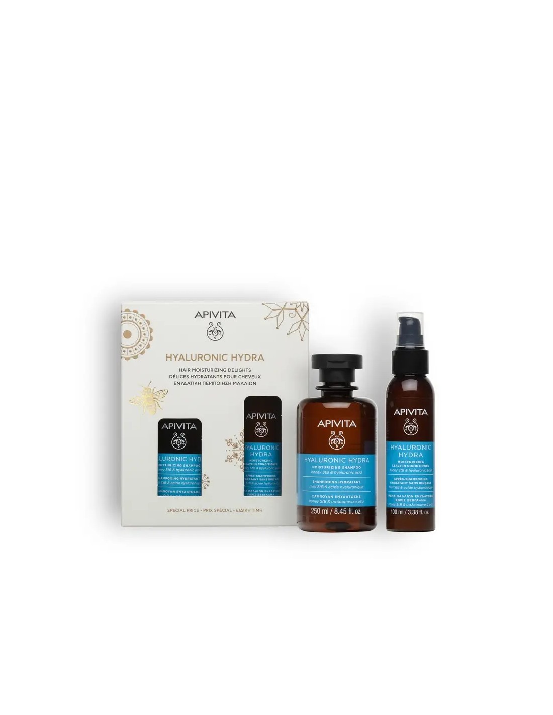 APIVITA PROMO HYDRATION es un dúo hidratante compuesto por el champú Hydration y el acondicionador sin aclarado de la misma línea, diseñado para proporcionar una hidratación profunda y duradera al cabello seco o deshidratado. El champú limpia suavemente mientras restaura el equilibrio de humedad natural, dejando el cabello más suave, flexible y lleno de vitalidad. El acondicionador sin aclarado ofrece una nutrición inmediata que facilita el peinado, reduce el encrespamiento y protege frente a las agresiones externas. Su fórmula se basa en ingredientes naturales como el ácido hialurónico vegetal y extractos botánicos, característicos de APIVITA, que ayudan a mantener la hidratación y mejorar la salud capilar sin apelmazar.