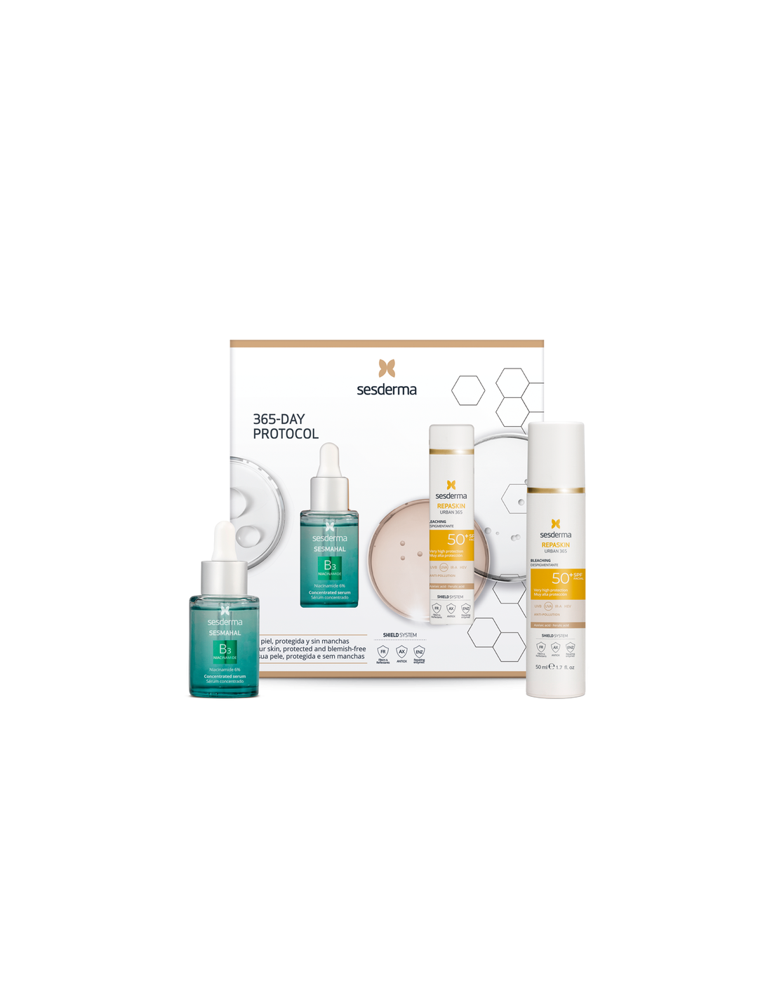 SESDERMA COFRE 365-DAY PROTOCOL es un exclusivo tratamiento dermatológico diseñado para el tratamiento de la manchas durante todo el año. Este cofre incluye una selección de productos formulados con activos innovadores que actúan sinérgicamente para mejorar la textura, luminosidad y firmeza del rostro. Está pensado para combatir los signos del envejecimiento, mejorar la hidratación y proteger la piel frente a las agresiones externas. Ideal para todo tipo de pieles, este protocolo diario se adapta a las necesidades cambiantes de la piel a lo largo de las estaciones.