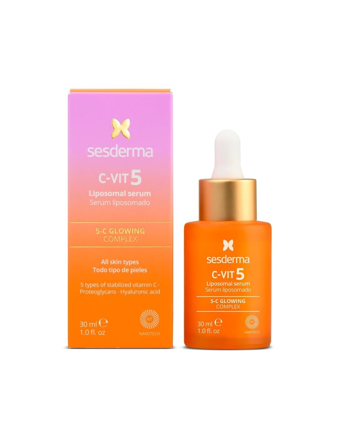 SESDERMA C-VIT 5 VITAMIN SERUM es un sérum facial antioxidante intensivo que combina 5 formas de vitamina C para proporcionar luminosidad, firmeza y protección frente al daño oxidativo. Este tratamiento está especialmente indicado para pieles apagadas, fatigadas o con signos de envejecimiento, ofreciendo un efecto revitalizante inmediato. Su fórmula avanzada mejora la elasticidad, estimula la síntesis de colágeno y ayuda a unificar el tono de la piel, aportando una apariencia más saludable y radiante.