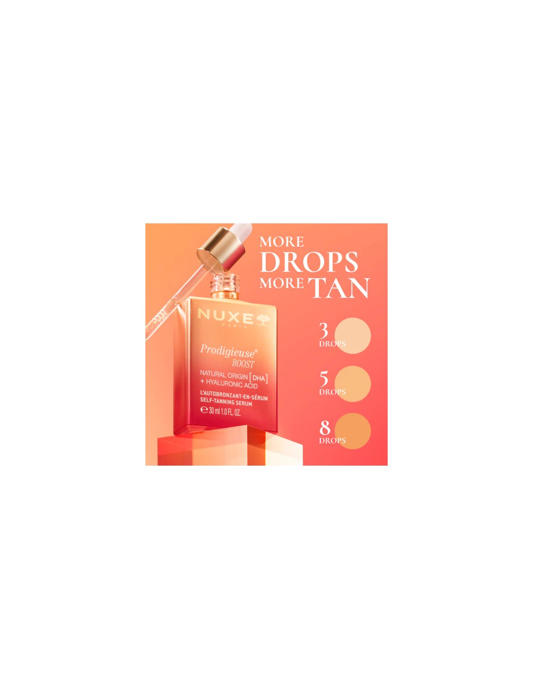 NUXE Prodigieuse Boost Sérum Autobronceador 30 ml es un tratamiento facial ligero que proporciona un bronceado natural y progresivo. Formulado para unificar el tono de la piel, aporta un aspecto saludable y luminoso sin exposición solar. Su textura sérum se absorbe rápidamente, hidratando y sublimando el cutis con un acabado suave y no graso.