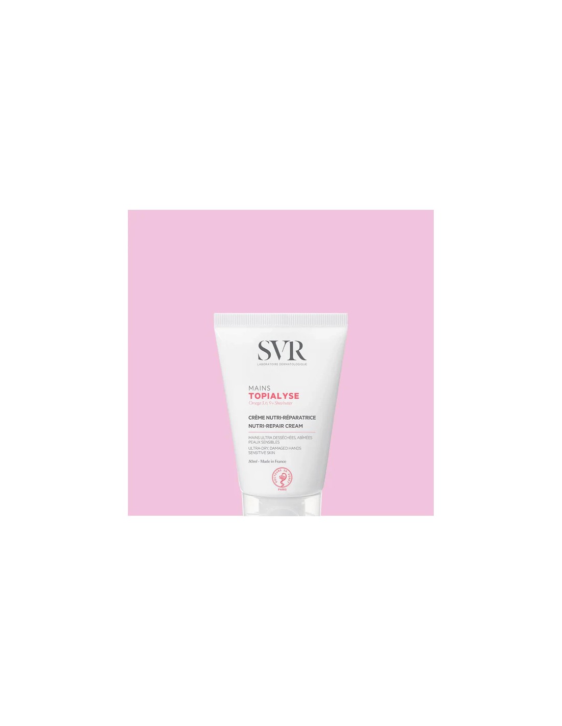 SVR Mains Topialyse 50 ml es una crema reparadora y nutritiva especialmente formulada para el cuidado intensivo de las manos secas, dañadas o agrietadas. Su fórmula dermatológicamente testada actúa como una barrera protectora contra las agresiones externas, tales como el frío, el lavado frecuente, los productos de limpieza y otros factores que debilitan la piel. Gracias a su textura no grasa y de rápida absorción, hidrata en profundidad, calma la sensación de tirantez y devuelve a las manos la suavidad y flexibilidad natural. Es adecuada incluso para pieles sensibles y puede ser utilizada por toda la familia, incluyendo niños a partir de 3 años.