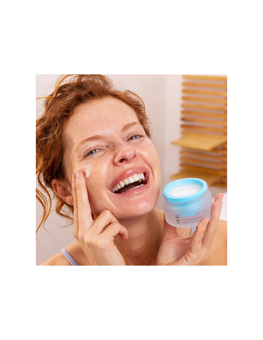 SVR Hyalu Biotic Crema 50 ml es un tratamiento facial reparador y rehidratante que combate los signos visibles del envejecimiento y la fatiga. Su innovadora fórmula actúa directamente sobre la barrera cutánea gracias a la combinación de ácido hialurónico, probióticos y vitamina C estabilizada. Esta sinergia favorece la regeneración celular, disminuye la apariencia de arrugas y líneas de expresión, y aporta luminosidad al rostro. Su textura ligera y fresca, de rápida absorción, lo convierte en un producto ideal tanto para pieles normales como para pieles secas o deshidratadas. Con el uso continuado, la piel se ve más lisa, firme, uniforme y visiblemente revitalizada.