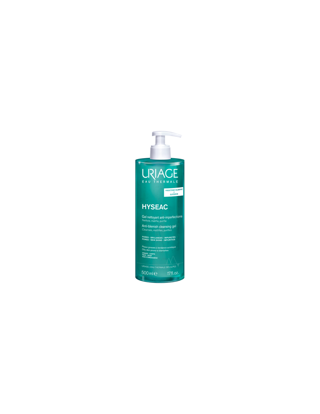 HYSEAC Gel Uriage 500 ml es un gel limpiador purificante especialmente formulado para pieles mixtas, grasas o con tendencia acneica. Su fórmula suave pero eficaz elimina impurezas, exceso de sebo y restos de maquillaje sin resecar la piel. Enriquecido con Agua Termal de Uriage, conocida por sus propiedades calmantes y protectoras, este gel ayuda a mantener el equilibrio natural de la piel y deja una sensación de frescor y limpieza duradera. Su base limpiadora sin jabón respeta el pH fisiológico, evitando irritaciones. Ideal para el uso diario en rostro y cuerpo, contribuye a mantener la piel limpia, matificada y con un aspecto más saludable.