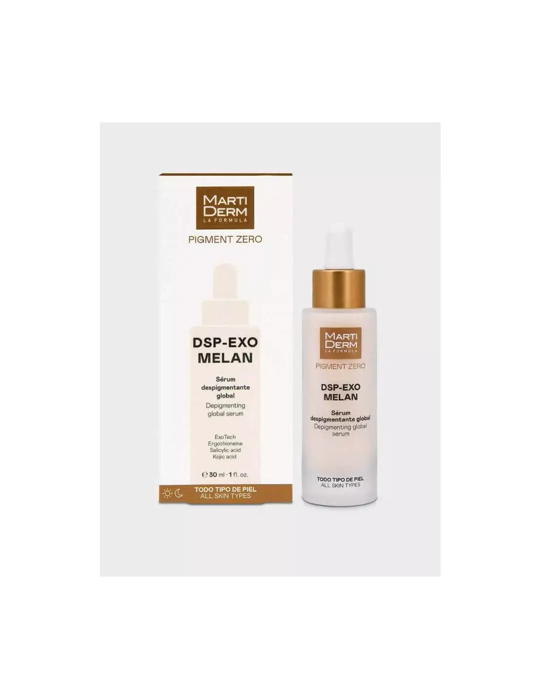 MARTIDERM DSP-EXO MELAN Serum Despigmentante 30 ml es un sérum avanzado formulado para reducir y prevenir las manchas cutáneas producidas por la exposición solar, el envejecimiento o desequilibrios hormonales. Su acción despigmentante ayuda a unificar el tono de la piel, proporcionando un acabado más luminoso y uniforme. Ideal para todo tipo de pieles, especialmente aquellas con tendencia a la hiperpigmentación, este sérum combina innovación científica con eficacia demostrada para mejorar la apariencia de la piel y prevenir la reaparición de manchas.