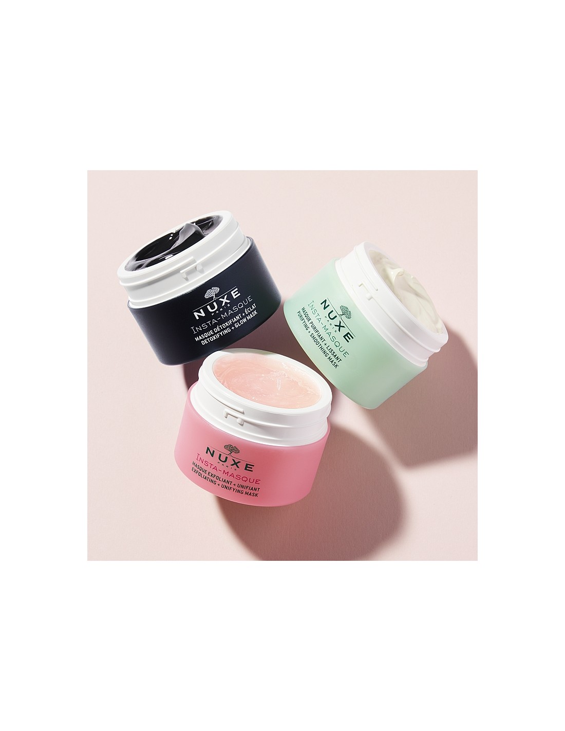 NUXE InstaMasque Purificante 50 ml es una mascarilla de tratamiento express diseñada para limpiar, purificar y equilibrar la piel en tan solo unos minutos. Su fórmula combina carbón activado y arcilla natural, dos ingredientes altamente reconocidos por su capacidad para absorber impurezas, exceso de sebo y partículas contaminantes. Gracias a su textura cremosa y suave, se extiende fácilmente sobre la piel, proporcionando una sensación inmediata de frescor y limpieza profunda sin resecar. Es ideal para pieles mixtas a grasas o para quienes buscan una limpieza intensiva que deje el rostro más luminoso, uniforme y con un aspecto saludable. Inspirada en los rituales naturales y sensoriales de NUXE, ofrece una experiencia agradable y eficaz.